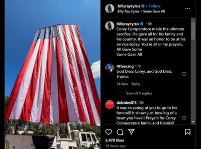 Vendredi 19 juillet, Cyrus s'est rendu à Cabot, en Pennsylvanie, pour respecter et honorer son héritage. Alors que le chanteur country a décidé d'interpréter une grâce incroyable et que certains ont tout donné, il a même partagé un clip de celui qui a participé aux funérailles et a divisé le poste, et Corey a fait la dernière victime. Il a tout donné pour sa famille et son pays. Ce fut un honneur d'être à leur service aujourd'hui. Ils sont tous dans ma prière. Tout le monde a donné SOM. Certains ont tout donné.